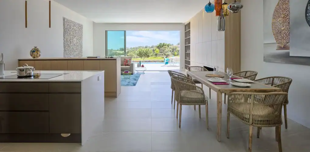 This meticulously designed villa spans 270 sqm (2,906 sq ft) and features high ceilings and expansive windows that enhance natural light and create an airy, open-plan living environment. Thoughtfully designed with intelligent features, the villa includes bi-folding kitchen units that can be closed to create a minimalist aesthetic, adding to the sleek, modern feel.