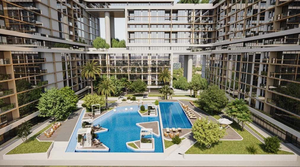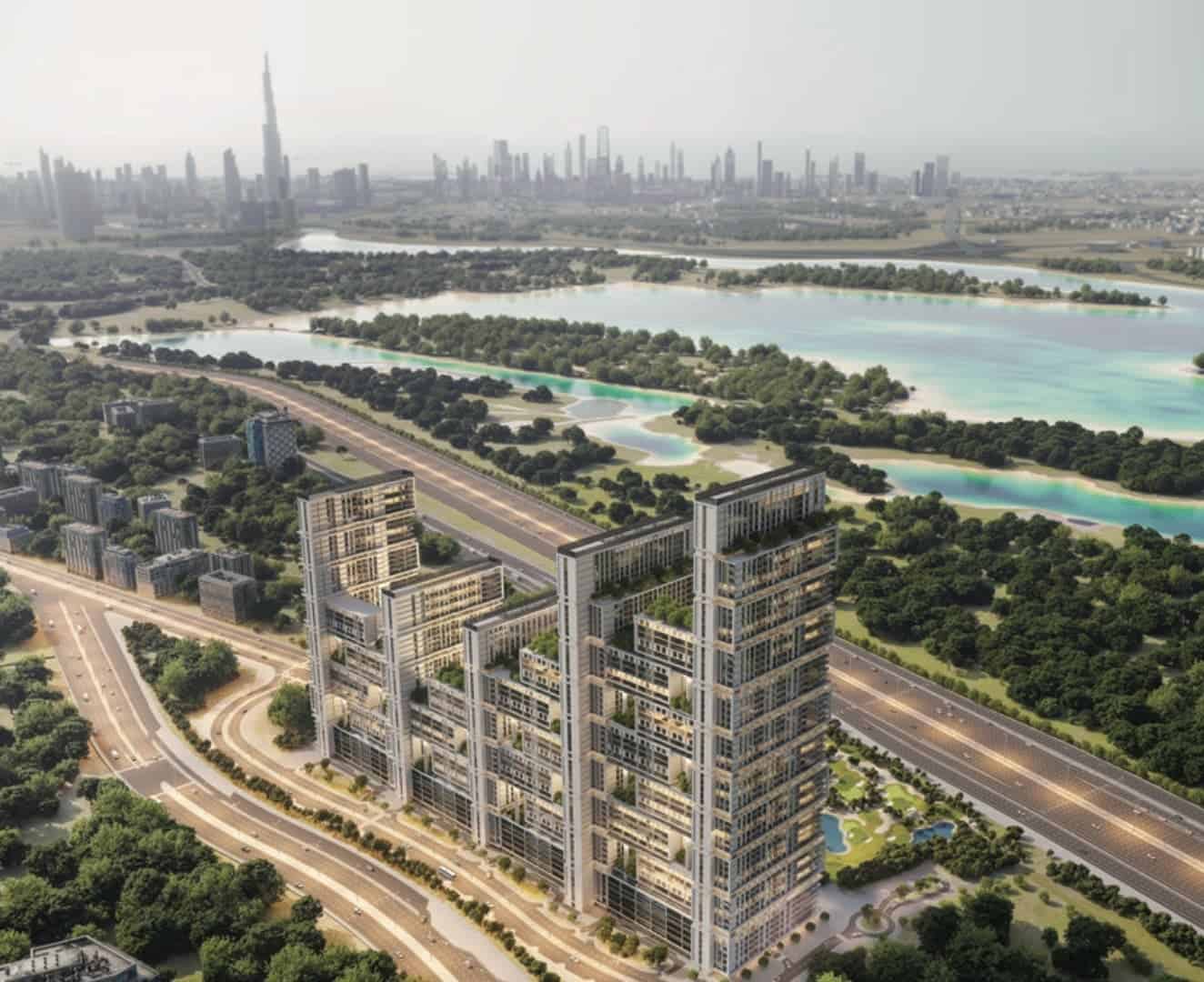 The project features five interconnected towers (ranging from 30 to 65 floors) designed with modern architecture and high-end finishes. The residential complex offers a wide range of luxury services that elevate everyday living. Large windows in every apartment provide breathtaking views of the city, the Dubai Canal, and the iconic skyline.